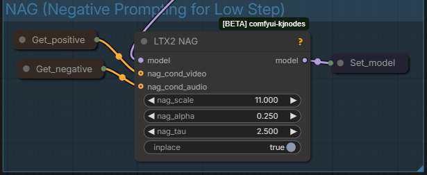 Allows the negative prompt to be used for low steps generation as it is usually dismissed with low steps 1 CFG workflows. If you feel it makes the generation worse you can disable by selecting both Get_positive and Get_negative and LTX2_NAG and shortcut Ctrl+B.