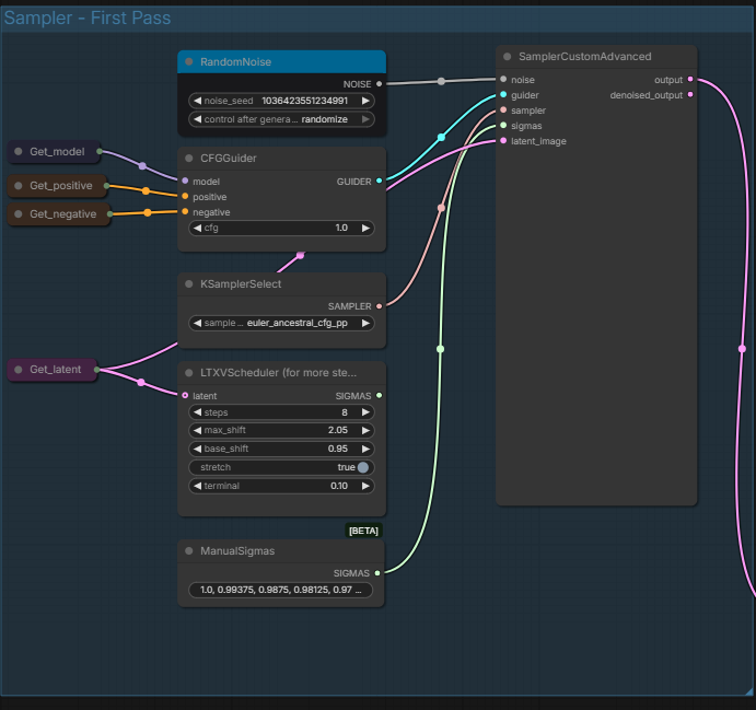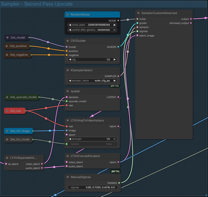 The main video generating sampler. You can set manually the noise seed, CFG (it's low step so usually keep at 1.0), the Sampler, and you can choose between using Sigmas of LTXVScheduler or of ManualSigmas. From text ManualSigmas seems to be better. The video is then generated through the Sampler and sent to the next Sampler.